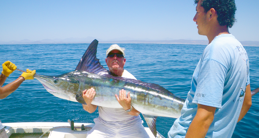 Another boat that did really well was Rebecca, who caught and released five striped marlin and a jack crevalle, making them our top boat today. The lucky angler was Jon Svendson, from Scottsdale, Arizon. They caught the marlin on ballyhoo and the jack crevalle on a lure; the water temperature was 78 degrees. Captain J.R is on the left, angler in the center and deckhand Luis Cota on the right.